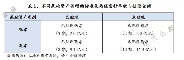 首批标准化票据成功创设 截止8月10日,共有27单标准化票据成功创设,创设规模合计24.53亿元。基础资产包含各种类型的票据(见表1),以商票为主,未贴现商票和已贴现商票分别有14单和8单。